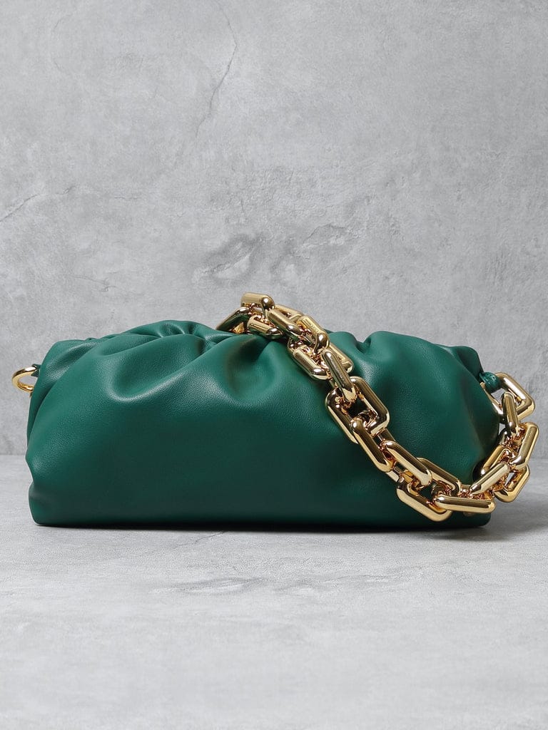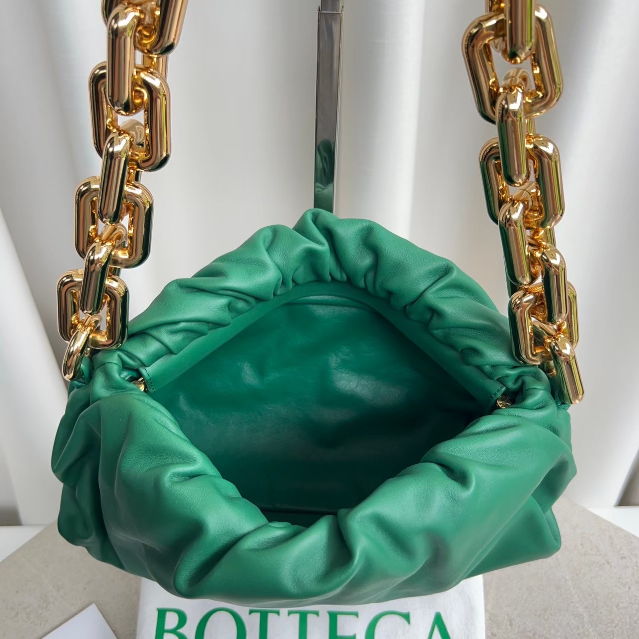 This is a BOTTEGA VENETA Leather Chain Pouch Shoulder Bag. The House of Bottega Veneta has created this stunning pouch bag to make an effortless style statement wherever you go. It is made from brown & Green leather and comes with a chunky gold-toned chain strap. Chic and charming, this beautiful pouch bag will amp up your trend factor in no time.