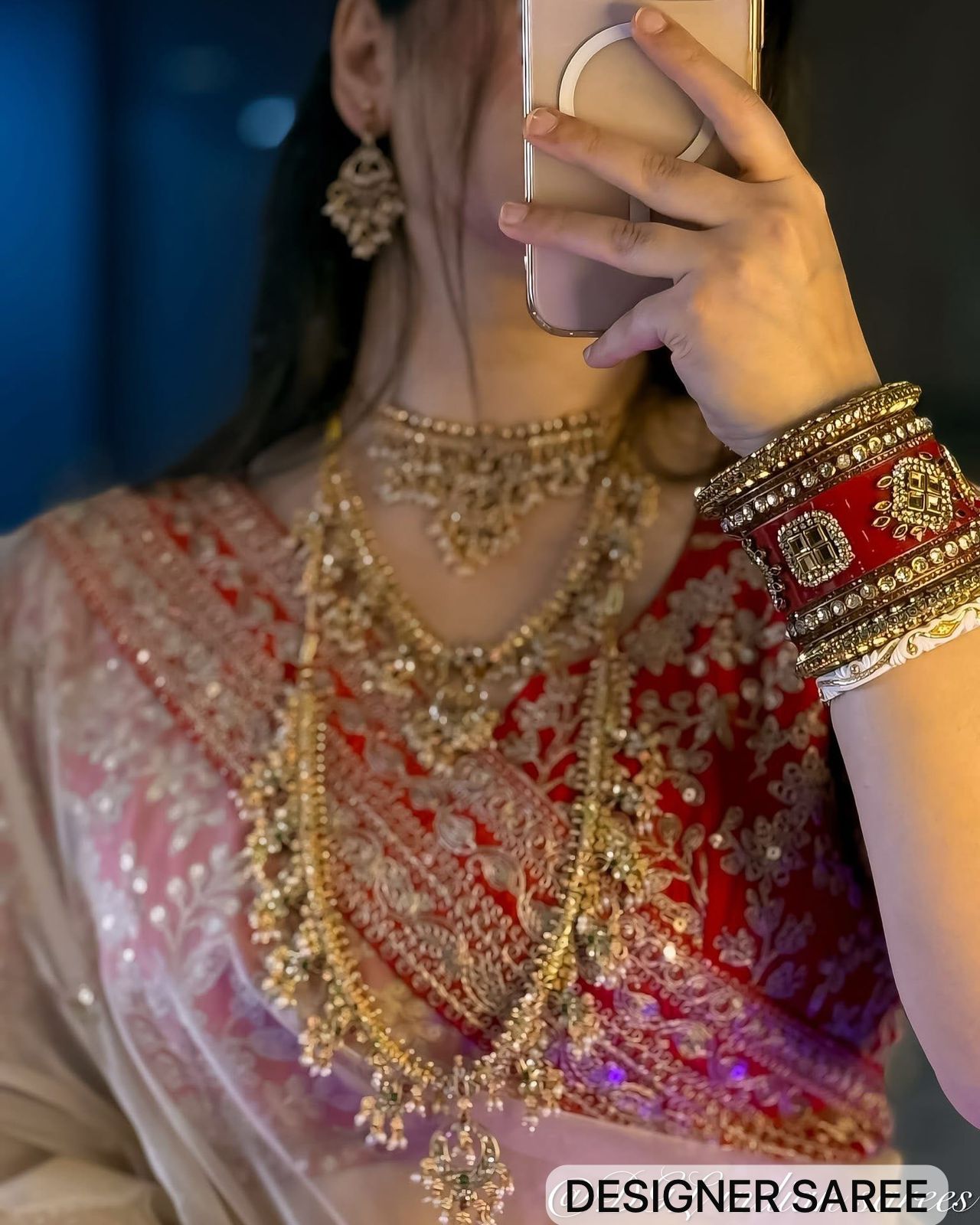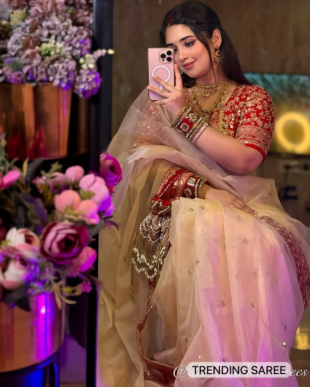 Unveil your inner fashionista with our stunning muted Champaign gold designer organza saree paired with the most sought-after Embroidery blouse in rich red.