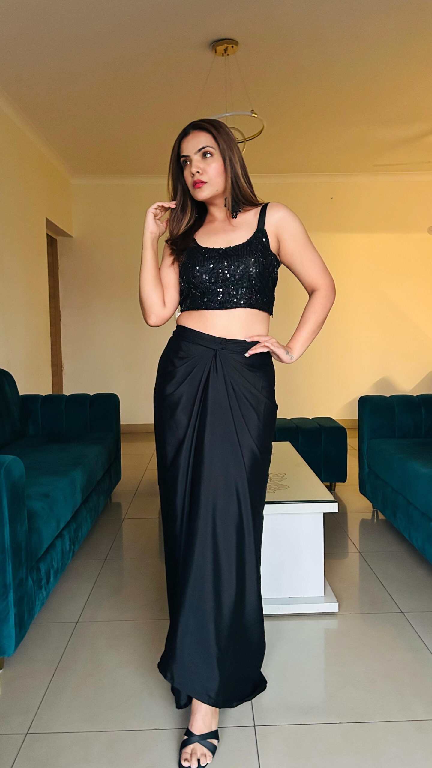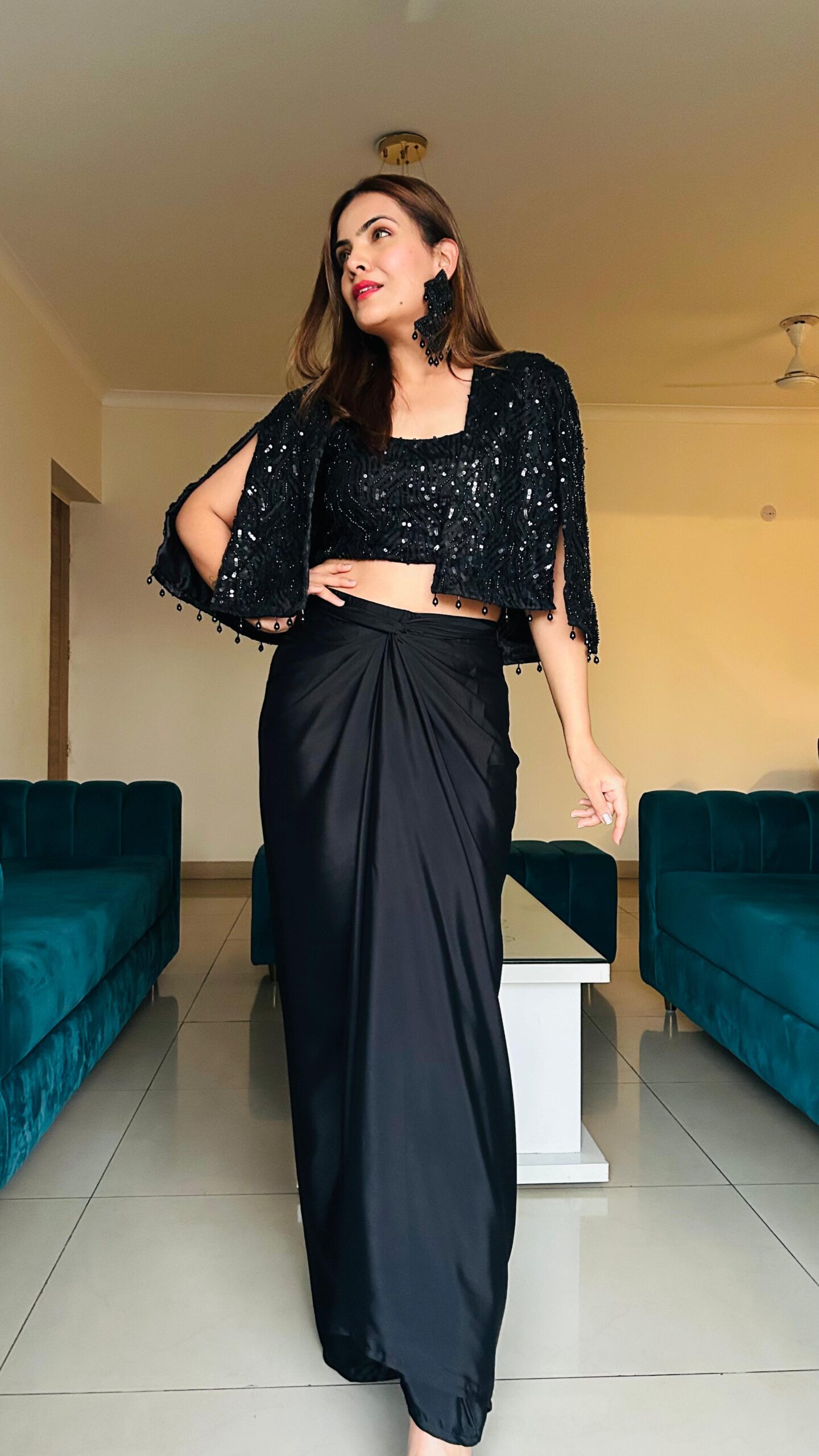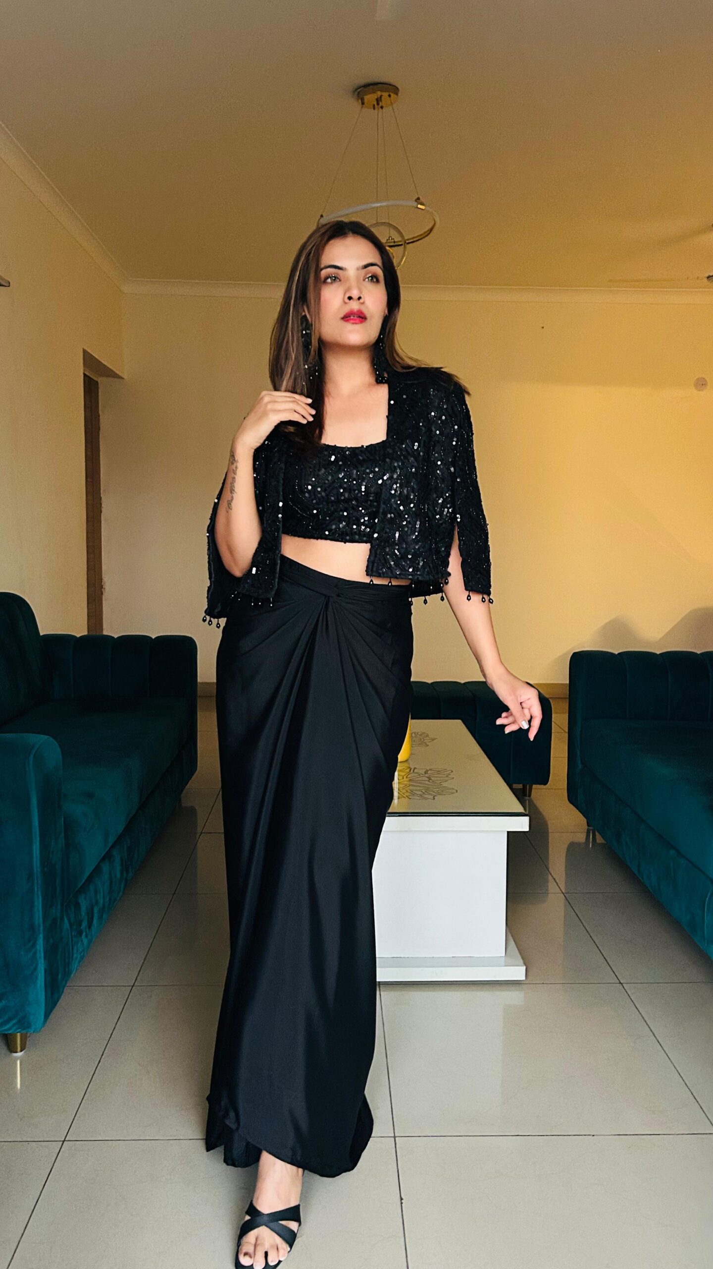 Designer Ready to wear drape skirt with crop top and crop jacket embellished with sequins and beads work.