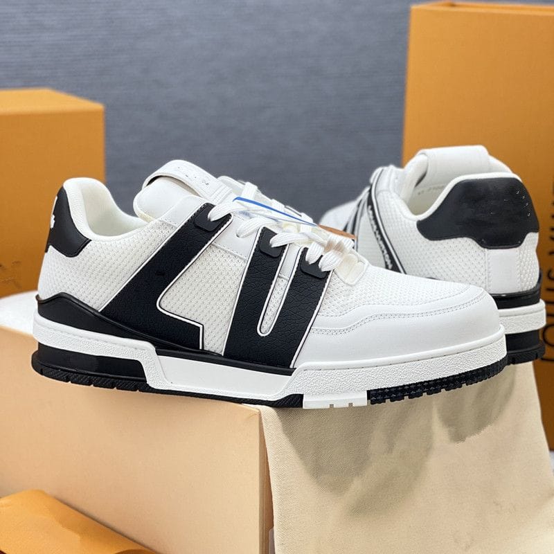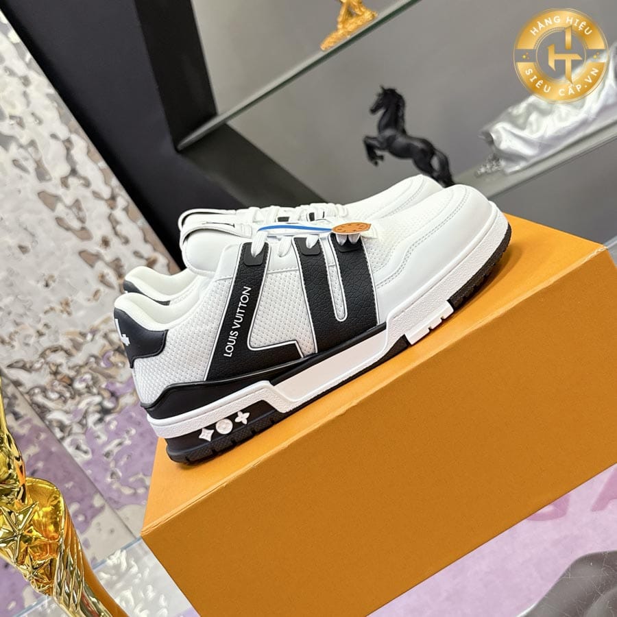 The LV Trainer White Black White features a black-and-white color scheme throughout the shoe.