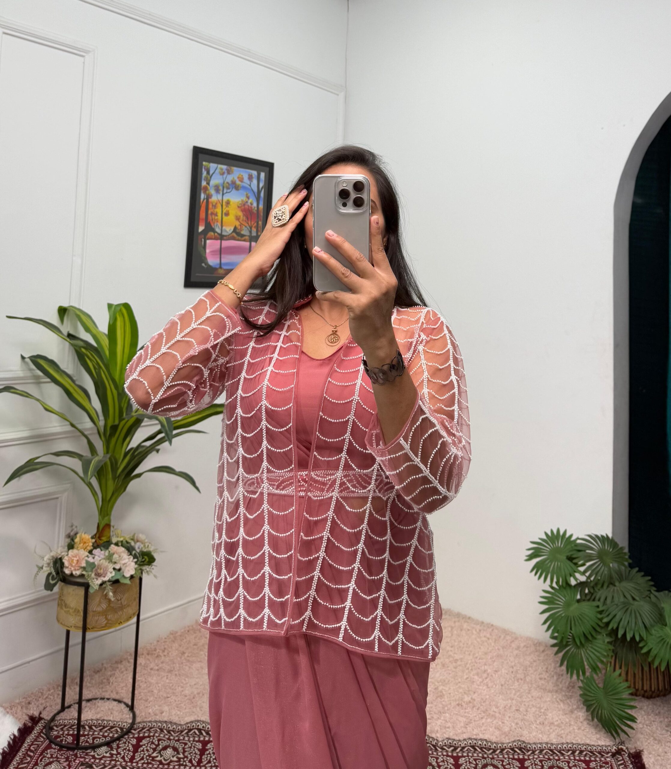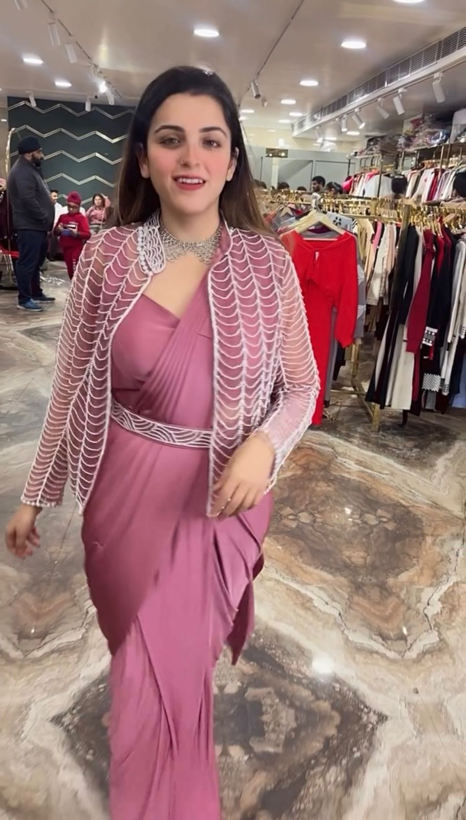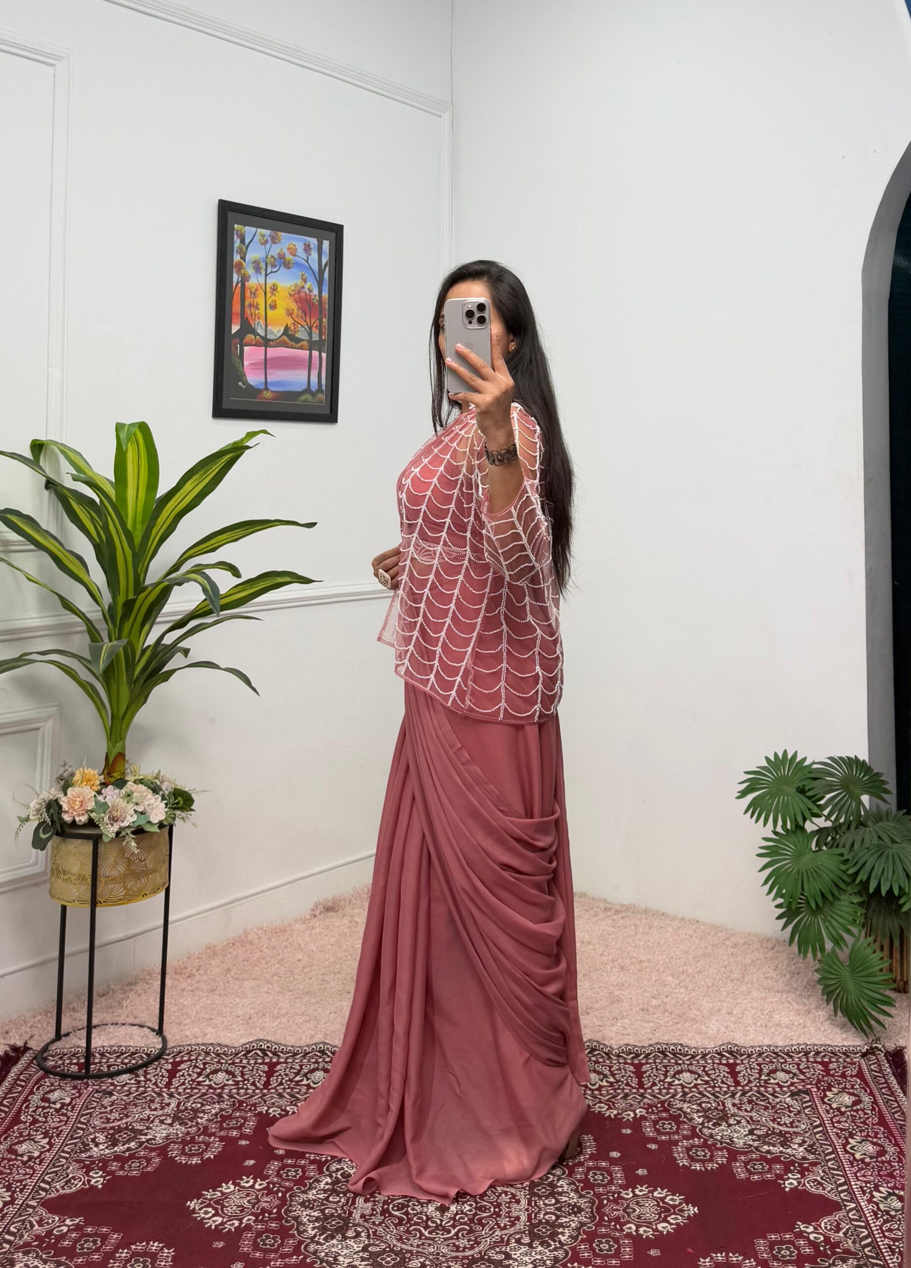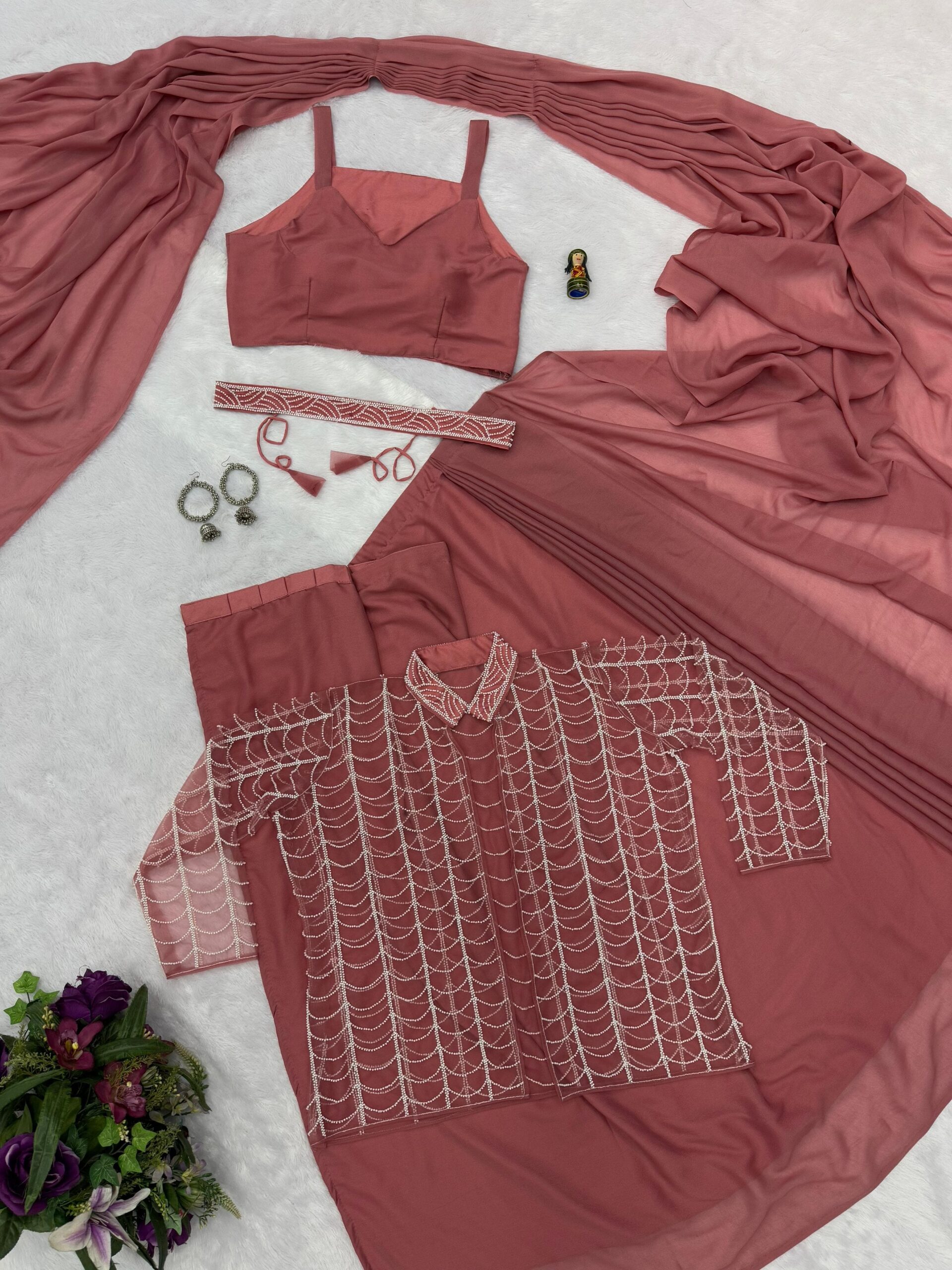 Designer drape with front slits, halter neck blouse fully embellished with hand work and sequence work